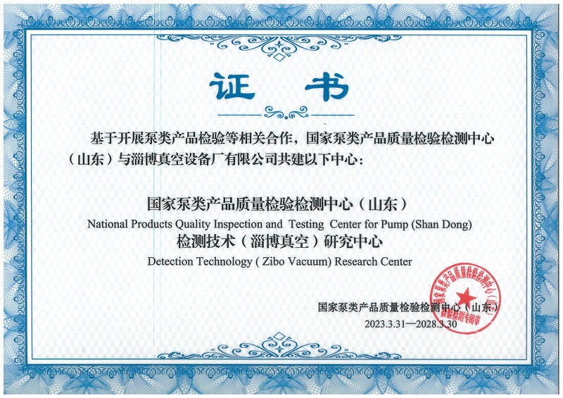 公司被國家泵業(yè)產品質量檢驗檢測中心授權為:國家泵類產品業(yè)質量檢驗檢測中心(山東)和檢測技術(淄博真空)研究中心
